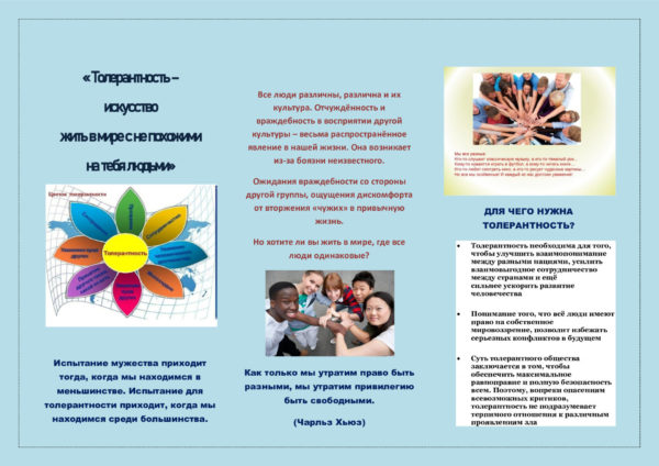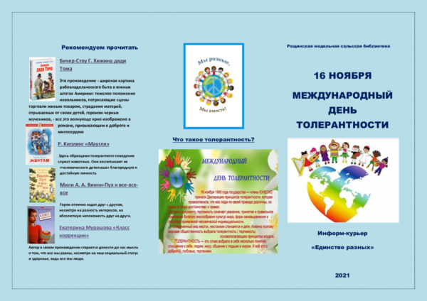 / Новости / 16 ноября - Международный День толерантности 16 ноября – Международный День толерантности К Международному Дню толерантности Рощинская библиотека подготовила информ-курьер “Единство разных” в виде буклета