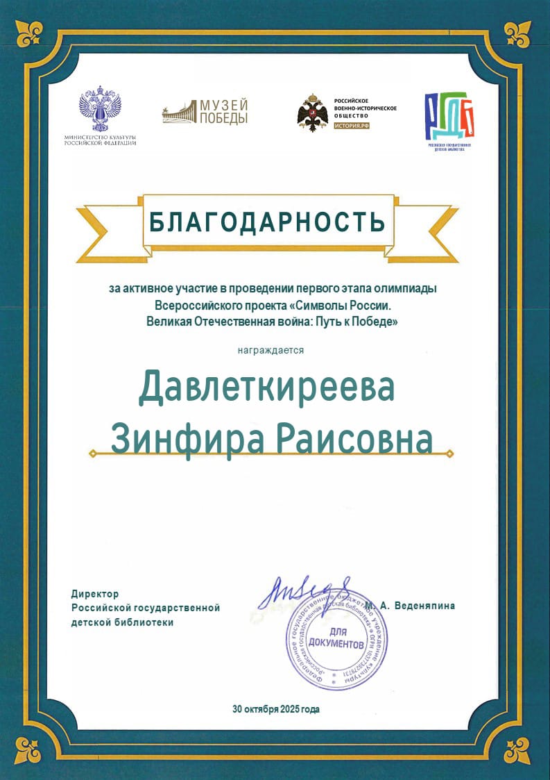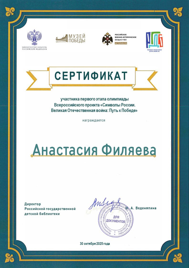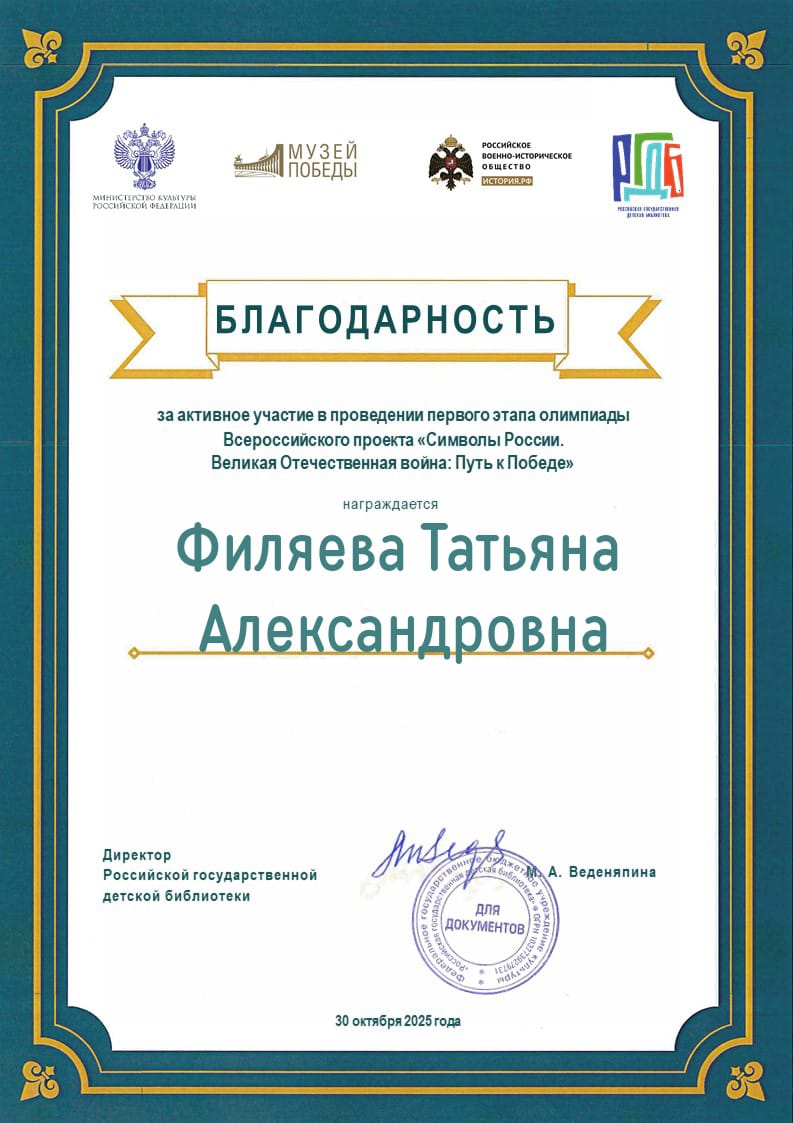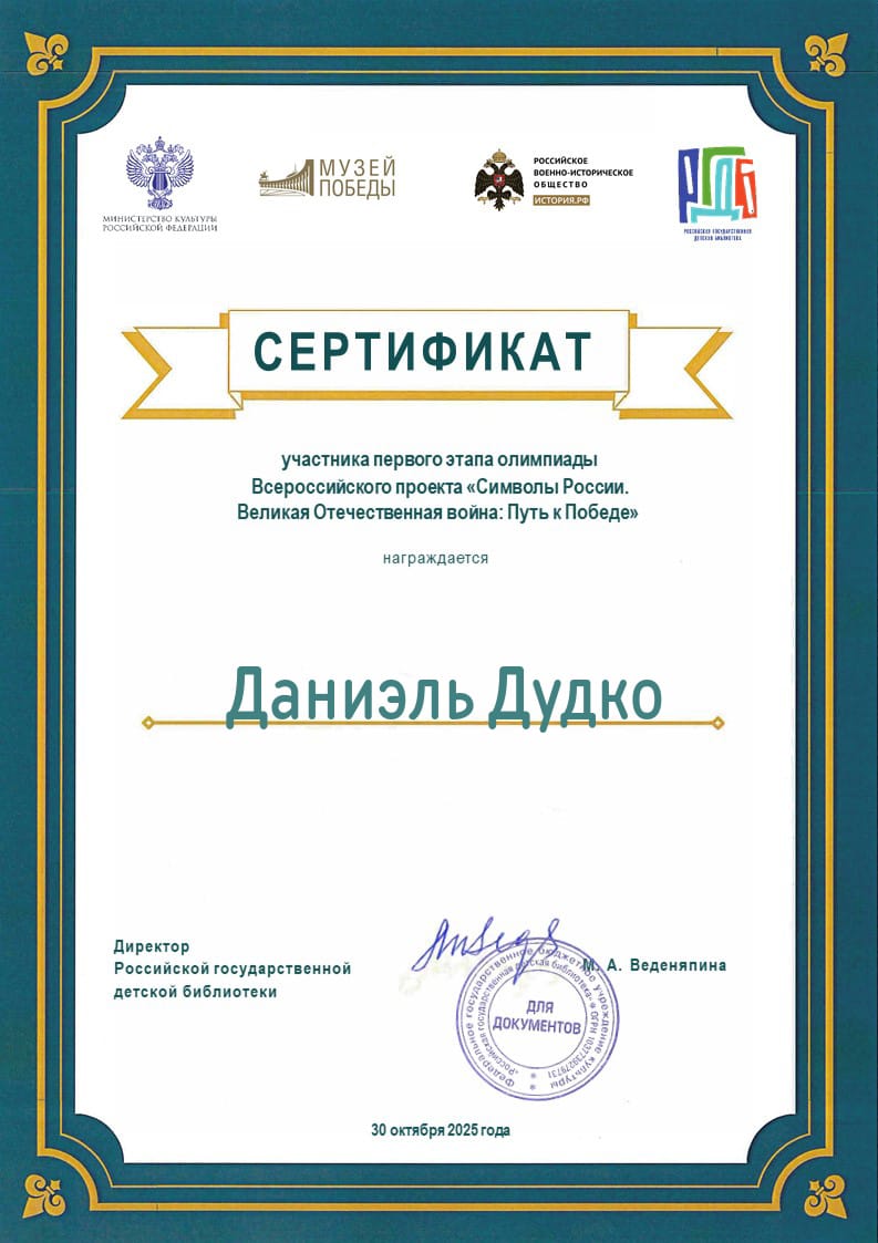 30 октября 2025 г. состоялся первый этап олимпиады Всероссийского проекта “Символы России. Великая Отечественная война: Путь к Победе”. Участникам предстояло ответить на 8 вопросов в формате выбора ответа, а также дать развернутый ответ на 9 и 10 вопросы. Победители и призеры Олимпиады будут награждены дипломами и записью о личном достижении на государственном информационном ресурсе о лицах, проявивших выдающиеся способности.