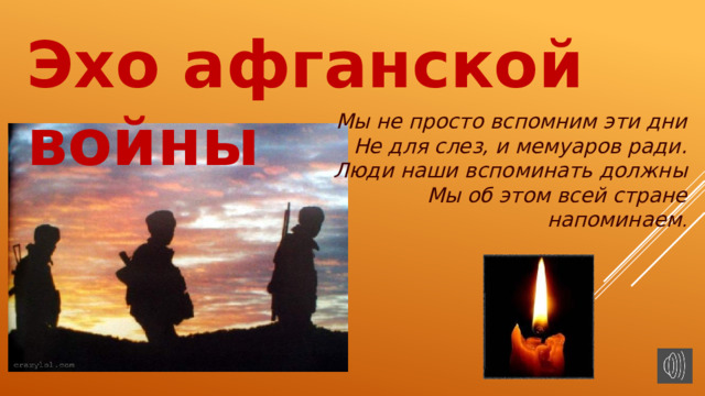 С каждым годом уходит все дальше эхо Афганской войны, но народы России никогда не забудут доблесть воинов – интернационалистов. Для каждого гражданина страны, чьё сердце наполнено любовью к своему Отечеству, афганцы навсегда останутся примером смелости и самоотверженности. Память о тех, кто прошел дорогами войны, и кто не вернулся в родной дом, для которых совесть, долг, Отечество, честь были главными в жизни, пусть останется в наших сердцах частицей гордости за них.
